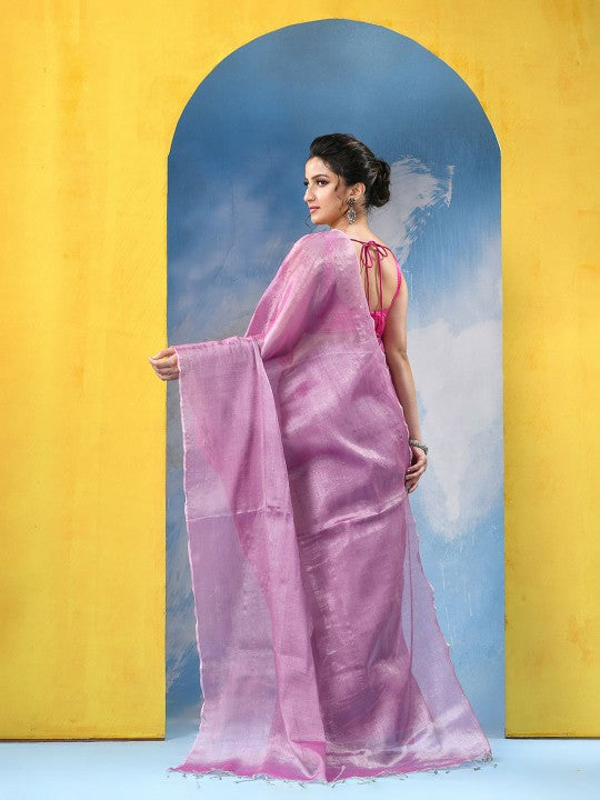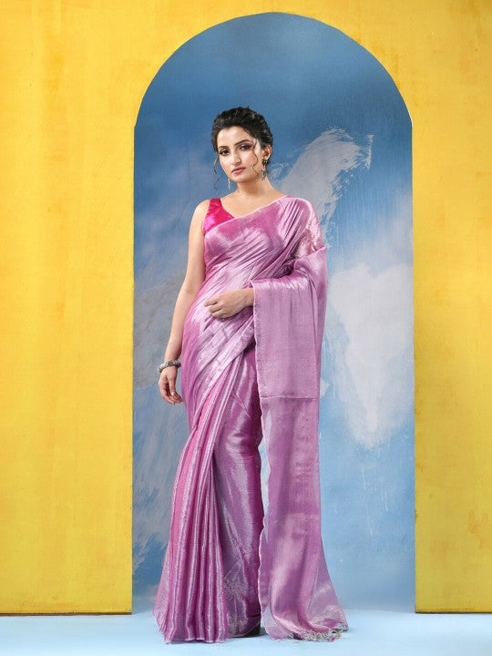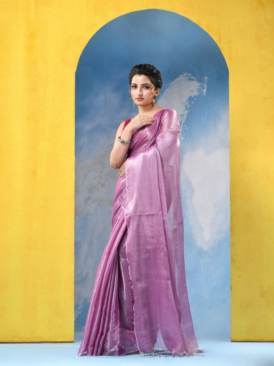 Experience timeless elegance with this exquisite pink tissue taant saree, meticulously crafted to enhance your grace. The saree features intricate embellishments, adding a touch of sophisticated charm without overwhelming the design. Its lightweight tissue fabric ensures comfortable drape, making it ideal for various occasions. The saree includes an unstitched blouse piece, allowing for custom tailoring to achieve a perfect fit. This piece embodies traditional Indian craftsmanship, offering a blend of heritage and contemporary style. The subtle sheen of the tissue fabric ensures a luxurious appearance. This saree is a testament to refined taste and enduring quality. It is designed for longevity and easy maintenance, requiring only dry clean care. This garment promises to be a versatile and cherished addition to your wardrobe.