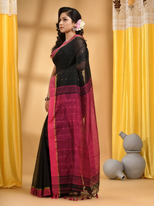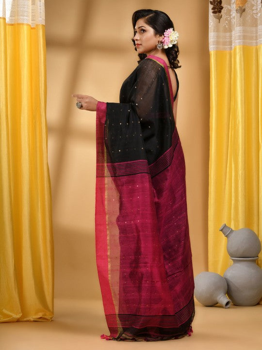 Black and fuchsia, gold toned saree. Embellished saree with solid border. Has sequinned detail. The saree comes with an unstitched blouse piece. The blouse worn by the model might be for modelling purposes only. Check the image of the blouse piece to understand how the actual blouse piece looks like.