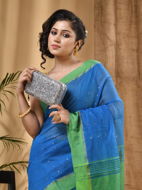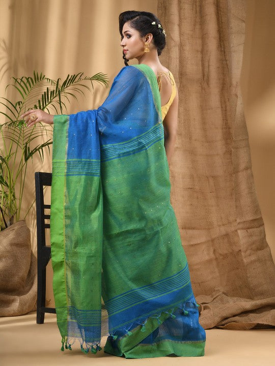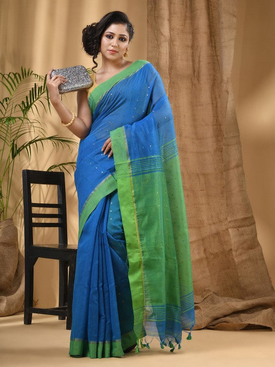Blue and green taant saree. Embellished saree with solid border. Has sequinned detail. The saree comes with an unstitched blouse piece. The blouse worn by the model might be for modelling purpose only. Check the image of the blouse piece to understand how the actual blouse piece looks like.