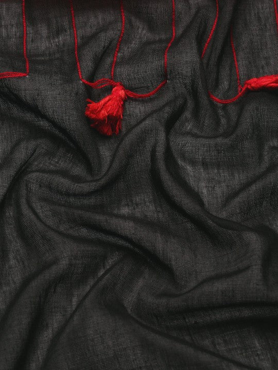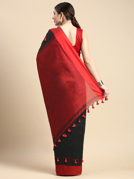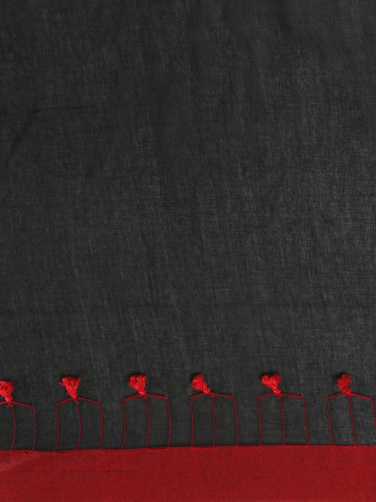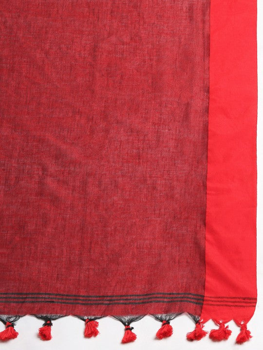 Red and black taant saree. Solid saree with solid border border. Has embroidered detail. The saree comes with an unstitched blouse piece. The blouse worn by the model might be for modelling purpose only. Check the image of the blouse piece to understand how the actual blouse piece looks like.