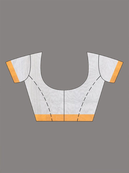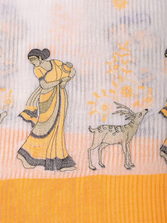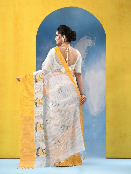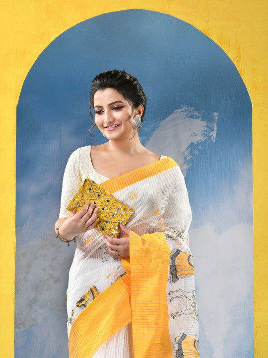 This exquisite DESH BIDESH Pure Cotton Khadi Saree features a beautiful white and yellow colour combination. It is adorned with intricate ethnic motifs embroidery and a distinctive striped border, adding to its traditional charm. The saree is crafted from comfortable pure cotton, ensuring a pleasant drape and feel. It comes complete with an unstitched blouse piece, allowing for customisation to your preference. Please note that the blouse worn by the model is for display purposes only; kindly refer to the provided image of the blouse piece for its actual appearance. This elegant saree is ideal for various cultural events, casual gatherings, or daily ethnic wear, offering a blend of classic style and comfort. Its durable fabric and timeless design make it a valuable addition to any wardrobe.