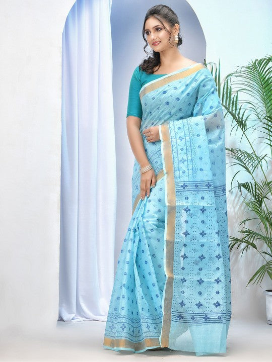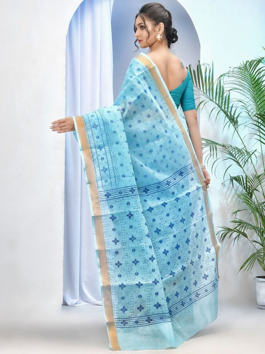 This exquisite blue and gold-toned pure cotton Taant saree from DESH BIDESH features charming ethnic motifs printed across its length. The elegant printed border adds a touch of traditional sophistication, making it perfect for various occasions. Crafted from premium pure cotton, this saree ensures exceptional comfort and breathability, ideal for India's diverse climate. Its lightweight fabric drapes beautifully, offering a graceful silhouette to the wearer. The vibrant blue hue, complemented by the subtle gold accents, presents a captivating aesthetic. This saree is a testament to timeless Indian craftsmanship and contemporary design. It is easy to maintain with a simple dry clean, ensuring its longevity and pristine appearance. Elevate your ethnic wardrobe with this distinctive piece that blends tradition with modern style. The rich print and soft texture promise a luxurious feel against the skin. Pair it with your favourite blouse and accessories for a complete, stunning look.