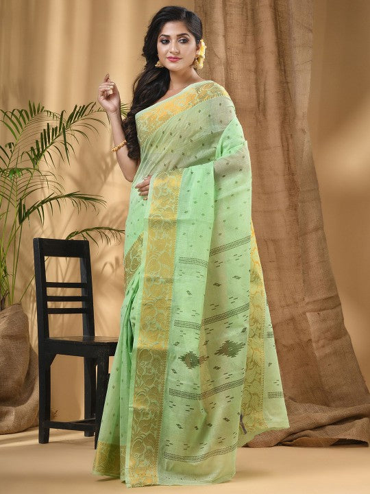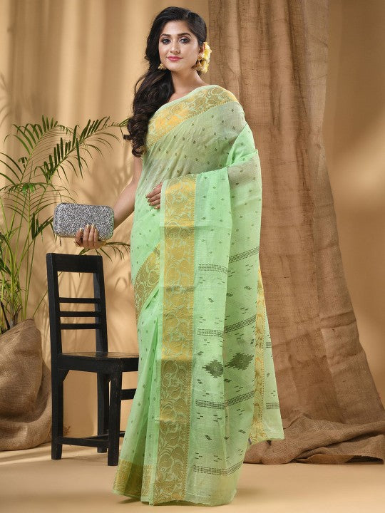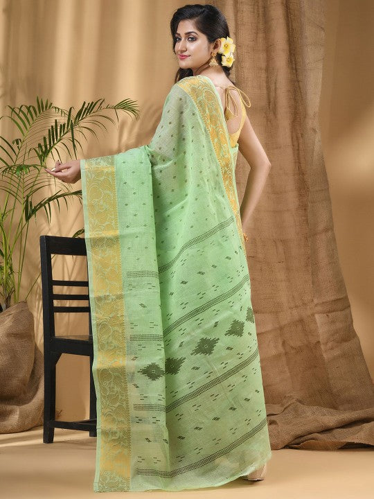 Experience the elegance of this exquisite pure cotton block print saree, meticulously crafted to perfection. This saree showcases traditional ethnic motifs woven into its design, offering a timeless appeal. The soft, breathable cotton fabric ensures exceptional comfort, making it suitable for prolonged wear. Its intricate details and vibrant green and sea green hues reflect a rich cultural heritage. The saree drapes beautifully, enhancing the wearer's silhouette with grace and sophistication. This piece is ideal for festive occasions, cultural events, or daily wear, providing versatility and style. The accompanying unstitched blouse piece allows for custom tailoring, ensuring a perfect fit. Maintenance is simple with dry clean only care, preserving its quality and intricate work. This saree is a testament to traditional artistry, offering both beauty and comfort.