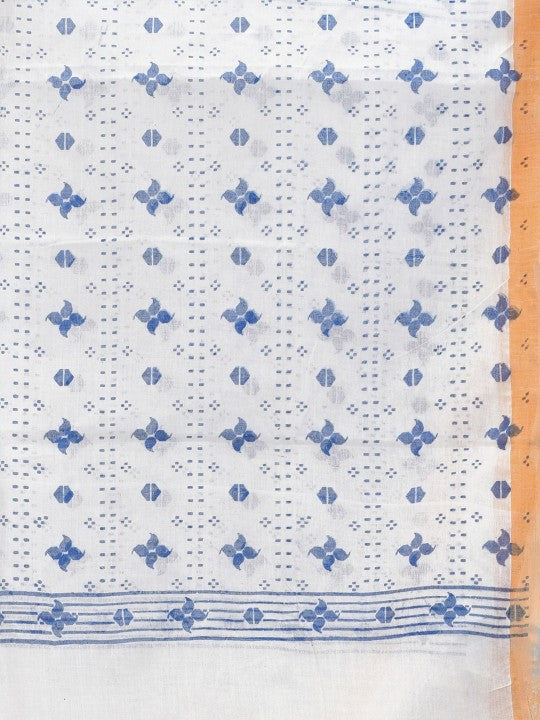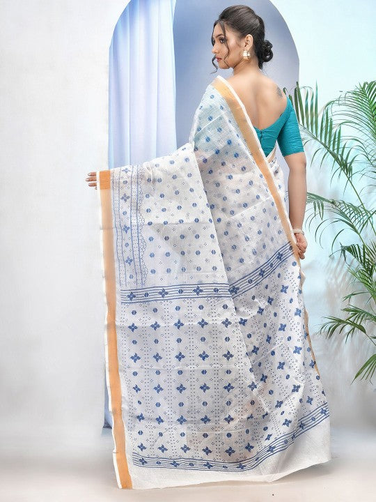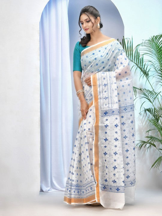 Experience the elegance of this exquisite white and blue Taant saree from DESH BIDESH. Crafted from pure cotton, this handloom saree features intricate ethnic motifs printed across its body. The design is further enhanced by a beautifully coordinated printed border, adding a touch of traditional charm. This lightweight and comfortable saree is perfect for daily wear or casual gatherings. Its breathable fabric ensures comfort throughout the day, while the vibrant ethnic patterns make it a standout piece. The saree comes with an unstitched blouse piece, allowing for customisation to your preference. Embrace timeless Indian artistry with this versatile and stylish pure cotton saree. It drapes beautifully, offering a graceful silhouette for every wearer. A must-have addition to your ethnic wardrobe, celebrating traditional craftsmanship. This saree combines comfort with traditional aesthetics, making it ideal for various occasions.