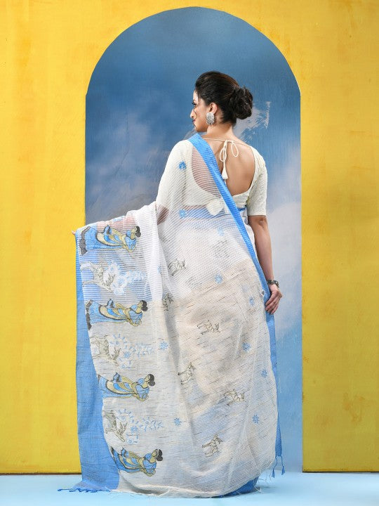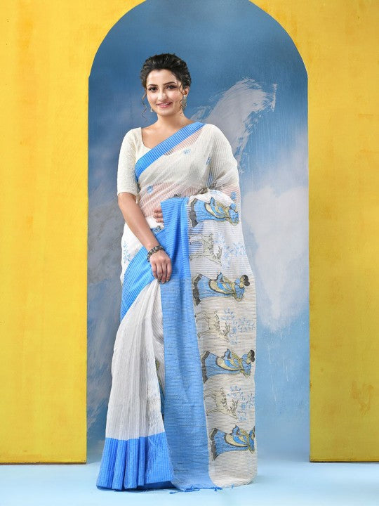 This elegant DESH BIDESH saree features ethnic motifs, perfect for traditional occasions. Crafted from pure cotton khadi, it offers both comfort and style. The white and blue colour combination with a striped border adds a classic touch. Each saree includes an unstitched blouse piece for a custom fit. Please note, the model's blouse may differ from the actual unstitched piece provided. This exquisite saree is a blend of traditional artistry and modern design, ideal for women seeking a graceful and authentic look. It provides a comfortable drape, ensuring ease of movement. The intricate ethnic prints enhance its aesthetic appeal. This pure cotton khadi saree promises durability and a soft feel against the skin. Elevate your ethnic wardrobe with this beautiful and versatile piece from DESH BIDESH.