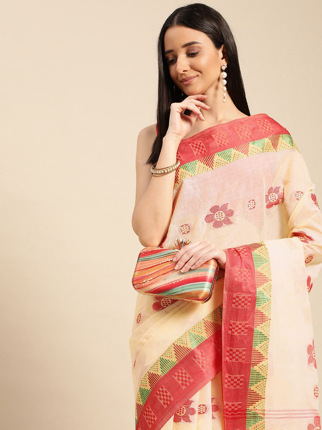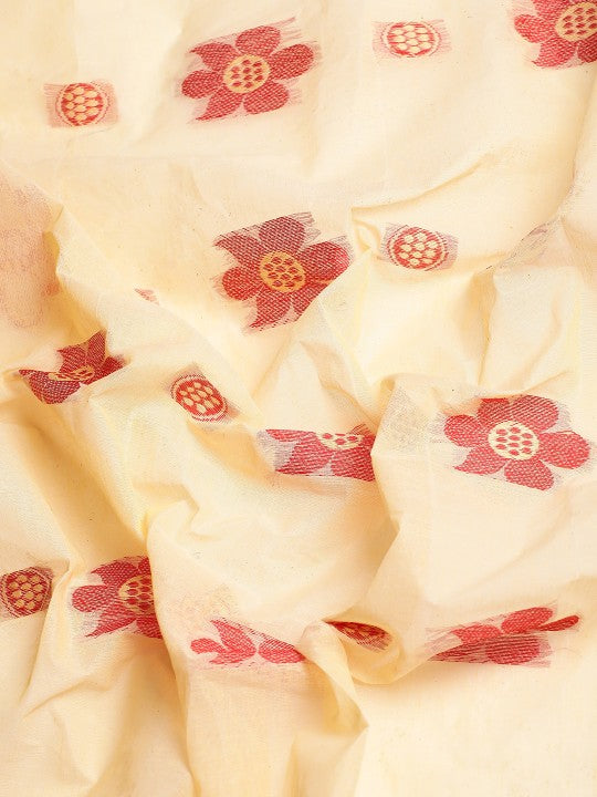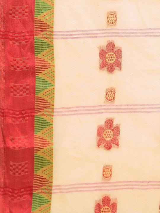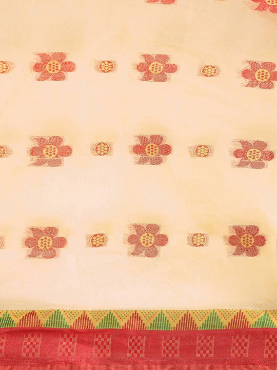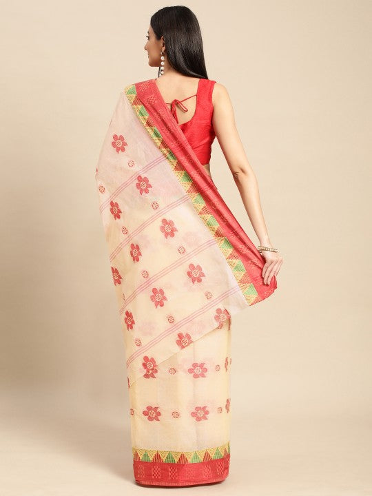 This elegant Red Taant Saree from DESH BIDESH features intricate ethnic motifs with a beautiful woven design border, perfect for traditional occasions. Crafted from 100% pure cotton, it offers exceptional comfort and a graceful drape. The saree measures approximately 18.04 feet in length and 3.47 feet in width, providing ample fabric for various draping styles. Please note that this saree does not include a blouse piece; the model is wearing a separate blouse for styling. To maintain its pristine condition, dry cleaning is recommended. Avoid tumble drying and iron on low heat to preserve the delicate fabric and woven patterns. Professional dry cleaning is advised for best care results. Do not use bleach on this exquisite cotton saree. This piece blends traditional artistry with modern wearability, making it a timeless addition to your ethnic wardrobe.