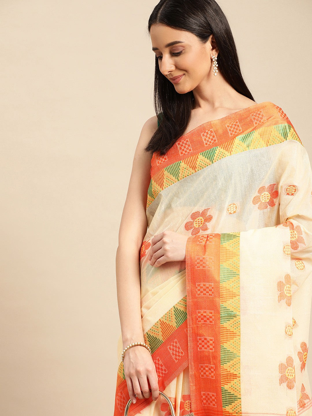 This elegant orange taant saree features ethnic motifs woven design and a distinctive woven design border. Crafted from 100% pure cotton, it ensures comfortable wear. The saree measures 18.04 feet in length and approximately 3.48 feet in width. Please note, this saree does not include a blouse piece; the model is wearing a separate blouse for styling purposes only. For care, dry clean only; do not tumble dry, iron on low heat, or bleach, ensuring its longevity and vibrant appearance.