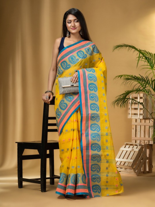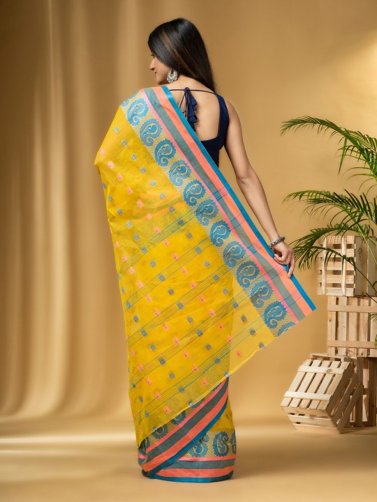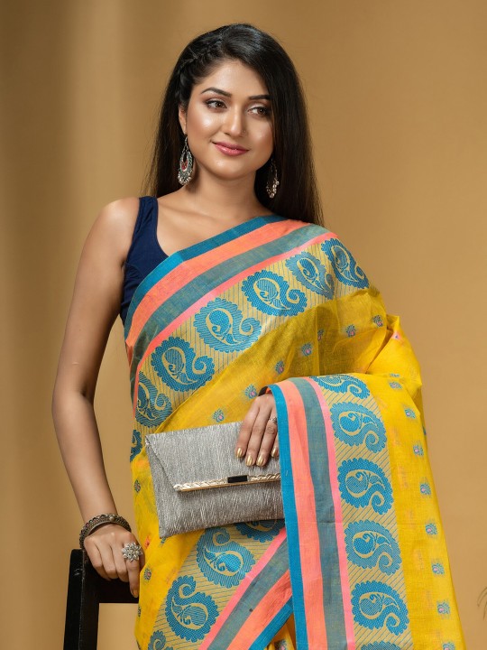 Description Presenting the exquisite DESH BIDESH Yellow and Blue Pure Cotton Taant Saree, a masterpiece of traditional Indian craftsmanship. This stunning saree features intricate ethnic motifs, meticulously woven into the pure cotton fabric. A beautifully designed woven border enhances its overall elegance and charm. The vibrant yellow and blue hues create a striking visual appeal, perfect for various festive occasions. Crafted from premium pure cotton, this saree ensures exceptional comfort and breathability throughout the day. Its lightweight and soft texture drapes gracefully, offering a flattering silhouette. The artistic woven design reflects rich cultural heritage and timeless beauty. This saree is ideal for women who appreciate classic ethnic wear with a contemporary touch. Please note, the saree does not include a separate blouse piece. Elevate your traditional wardrobe with this captivating and comfortable Taant saree.