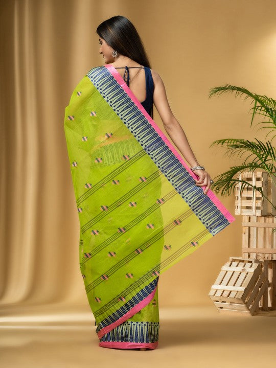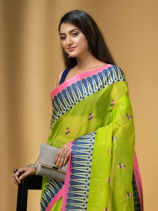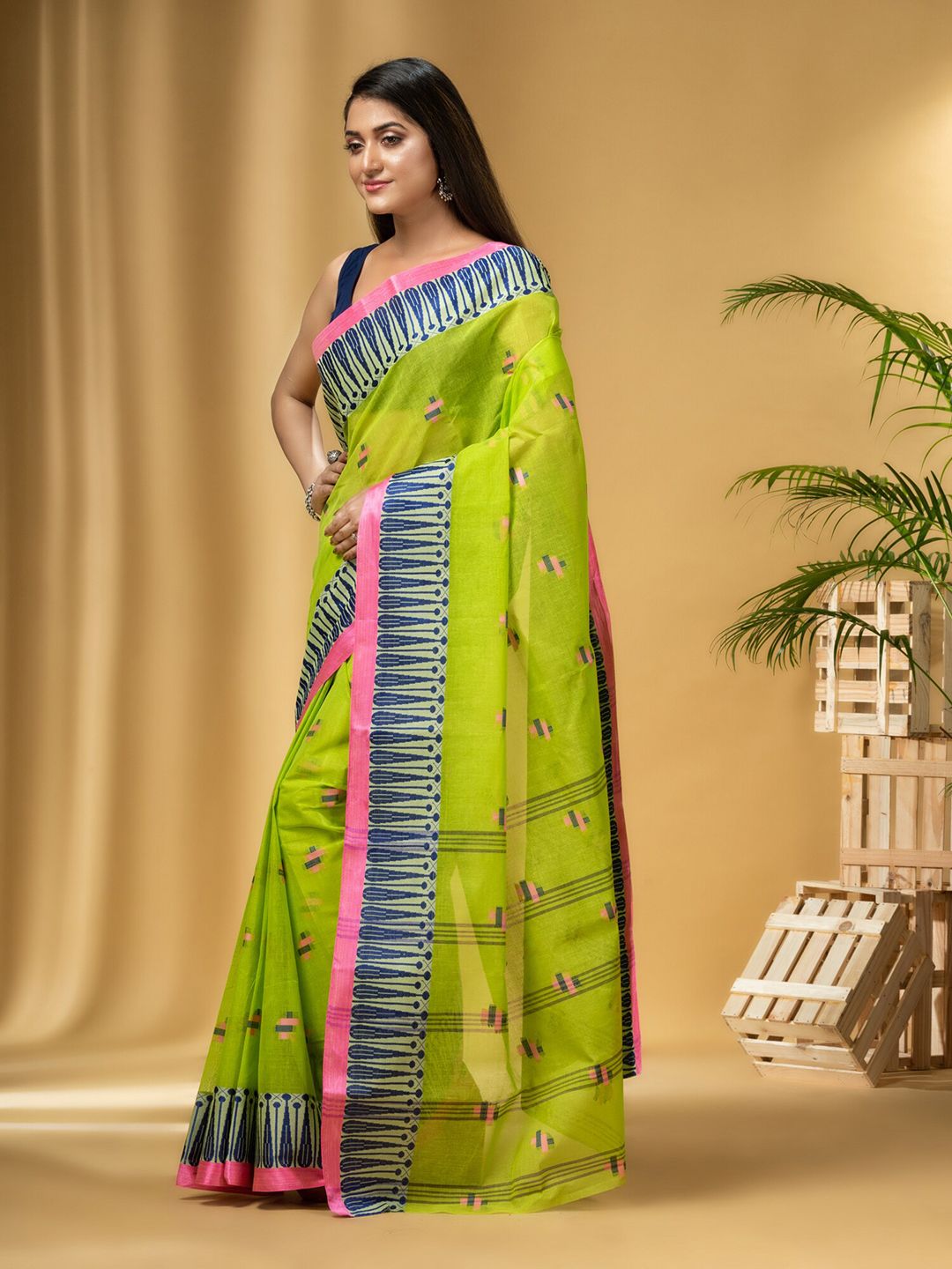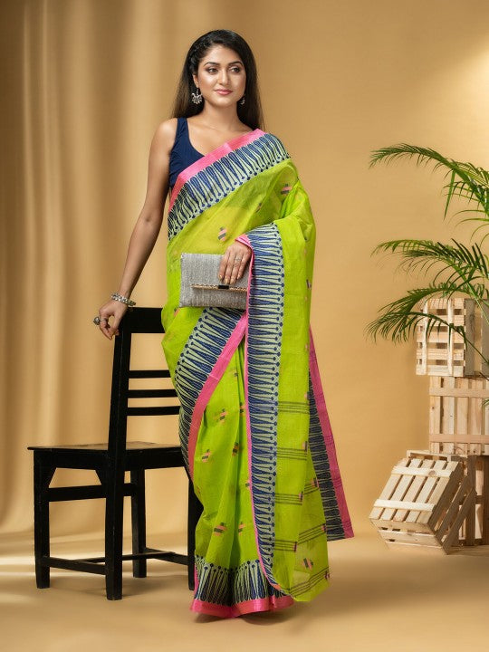 Green, blue & pink taant saree. Ethnic motifs woven design saree with solid border. The saree does not come with a blouse piece. The model is wearing a blouse for modelling purpose only.
