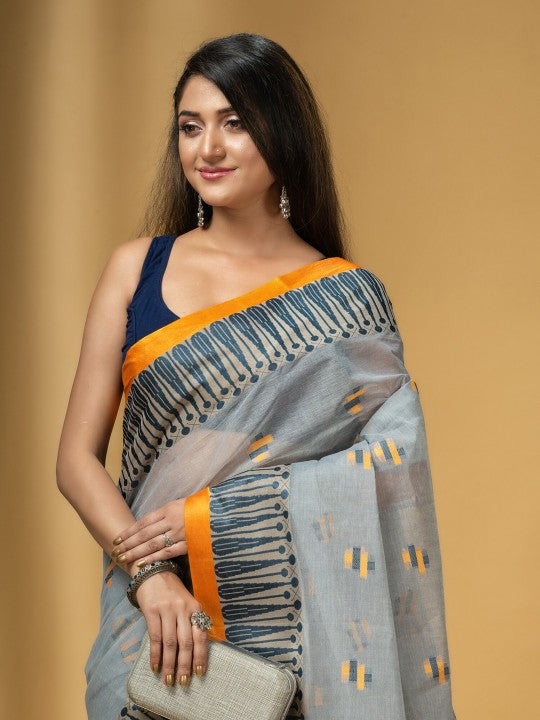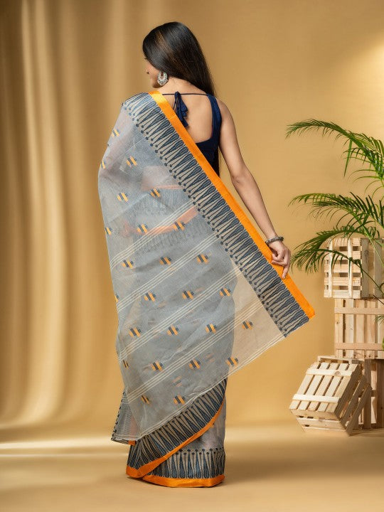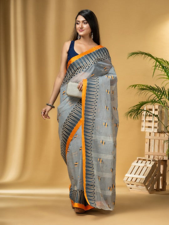 Experience the timeless elegance of the DESH BIDESH Grey Orange Pure Cotton Taant Saree. This ethnic woven design saree features a striking solid border, perfect for any special occasion. Crafted from premium pure cotton, it offers exceptional comfort and breathability. Please note, the saree does not include a separate blouse piece, allowing for personalized styling. Dry clean only to maintain its pristine condition. Elevate your traditional wardrobe with this exquisite piece.
