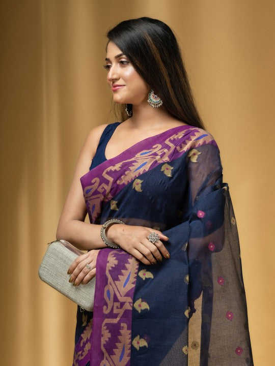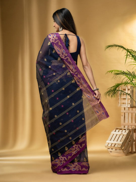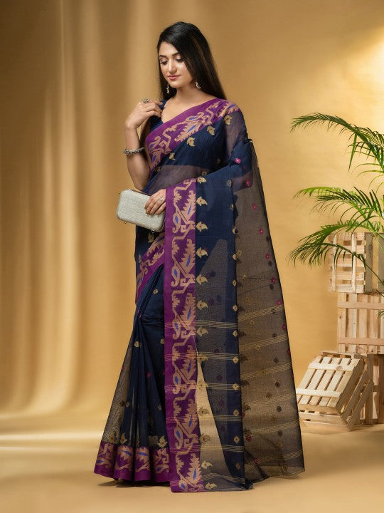 This saree features a blue, purple, and gold-toned taant design. It showcases ethnic motifs woven throughout the fabric, complemented by a solid border. The saree does not come with a blouse piece; the model is wearing a separate blouse for styling purposes only. Crafted from pure cotton, this saree offers comfort and a graceful drape. Its length is approximately 5.5 metres (18.0 feet). The width of the saree is approximately 1.06 metres (3.5 feet). For optimal care, dry cleaning is recommended. This traditional Indian attire is perfect for various occasions. It combines classic design with quality material. The intricate weaving highlights the rich cultural heritage.
