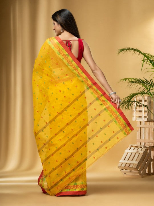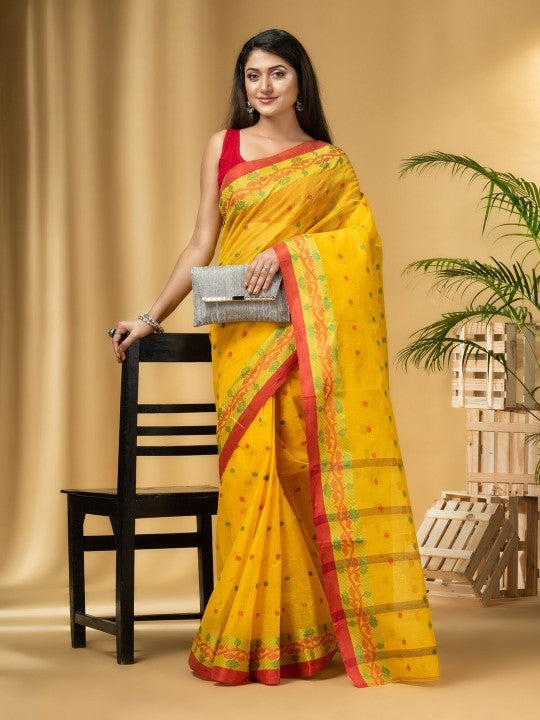 Yellow,red & green taant sareeEthnic motifs woven design saree with solid border The saree does not come with a blouse pieceThe model is wearing a blouse for modelling purpose only
