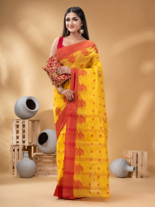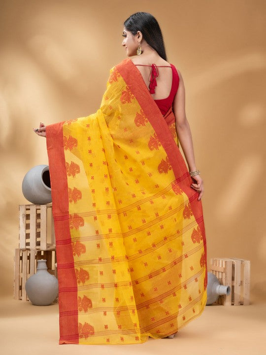 Buy DESH BIDESH Ethnic Motifs Woven Design Pure Cotton Taant Saree - Sarees for Women from DESH BIDESH at Rs. 1209. Style ID: 24933304. Yellow and red taant saree. Ethnic motifs woven design saree with woven design border. The saree does not come with a blouse piece. The model is wearing a blouse for modelling purpose only.