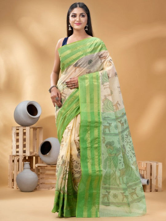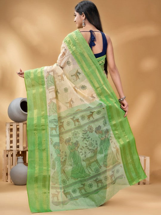 This exquisite DESH BIDESH Pure Cotton Taant Saree features a beautiful green and cream-coloured design. It showcases intricate ethnic motifs with a woven pattern. The saree is adorned with a delicate zari border, adding a touch of traditional elegance. Crafted from pure cotton fabric, it ensures comfort and breathability. This saree measures approximately 18.04 feet in length, including a 2.62 feet blouse piece. The width is approximately 3.48 feet, offering ample drape. For maintenance, dry cleaning is recommended to preserve its quality. This piece perfectly blends traditional craftsmanship with a contemporary appeal. It is an ideal choice for various occasions. Elevate your ethnic wardrobe with this stunning saree.