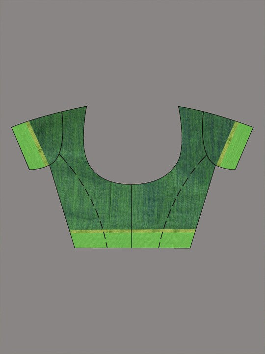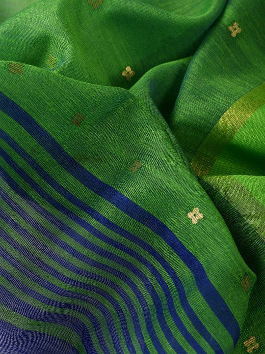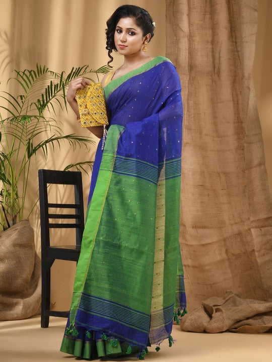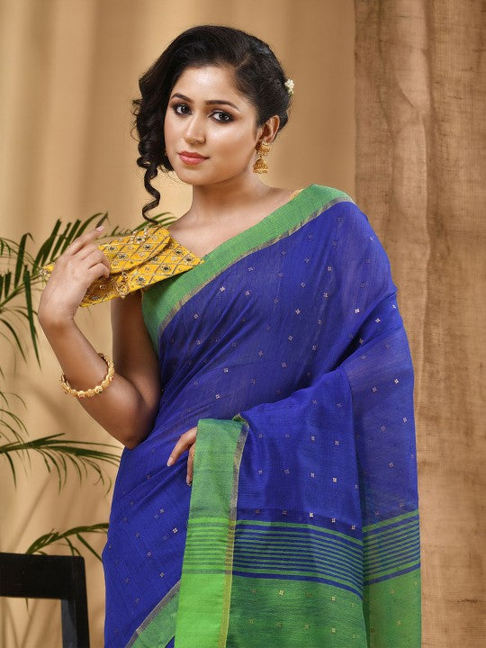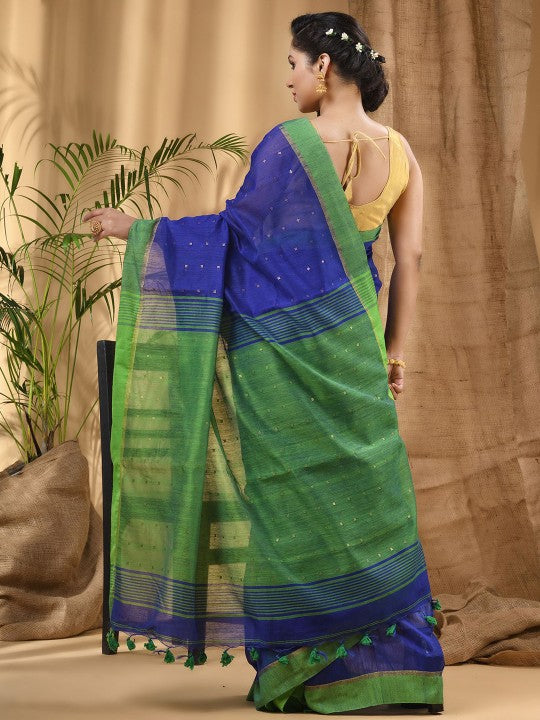 Blue and green taant saree. It features ethnic motifs. It has a woven design solid saree with solid border. It has sequinned detail. The saree comes with an unstitched blouse piece. The blouse worn by the model might be for modelling purpose only. Check the image of the blouse piece to understand how the actual blouse piece looks like.
