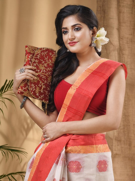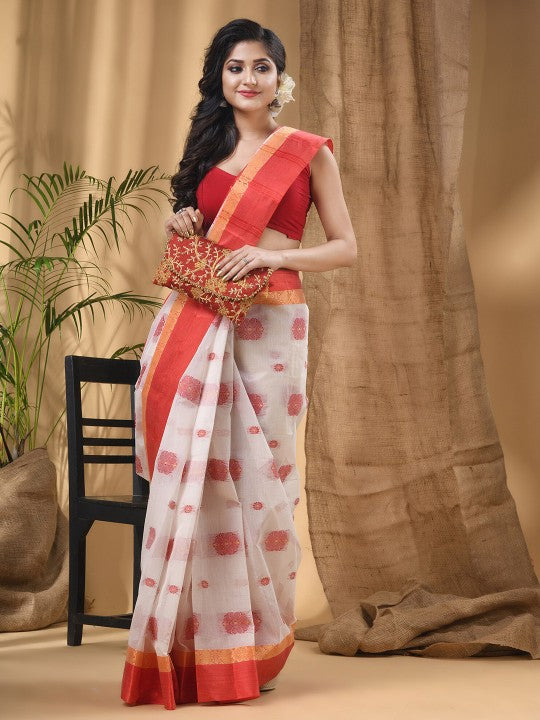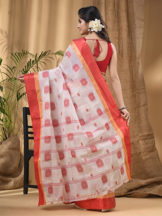 This exquisite DESH BIDESH saree showcases a traditional red and white colour palette, perfect for cultural celebrations. It features elegant ethnic motifs meticulously woven into the pure cotton fabric. The saree is enhanced with a beautifully woven design border, adding a touch of sophistication. Intricate zari detailing further elevates its traditional charm and appeal. Crafted from pure cotton, this taant saree ensures exceptional comfort and breathability throughout the day. Its lightweight nature allows for a graceful and flattering drape on any body type. Designed for durability, this piece requires dry cleaning to maintain its pristine condition. This timeless attire is suitable for various festive occasions, from pujas to family gatherings. Adorn yourself in this classic saree to embody traditional Indian elegance. It promises to be a valuable and cherished addition to your ethnic wardrobe.