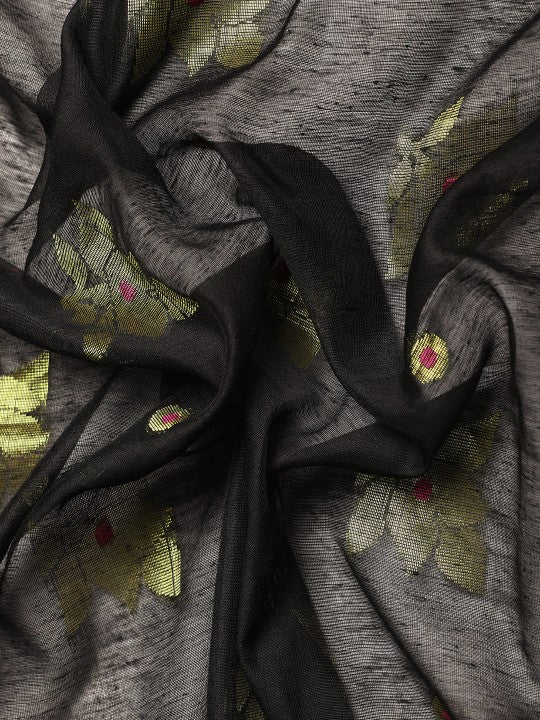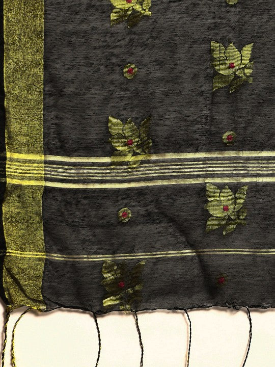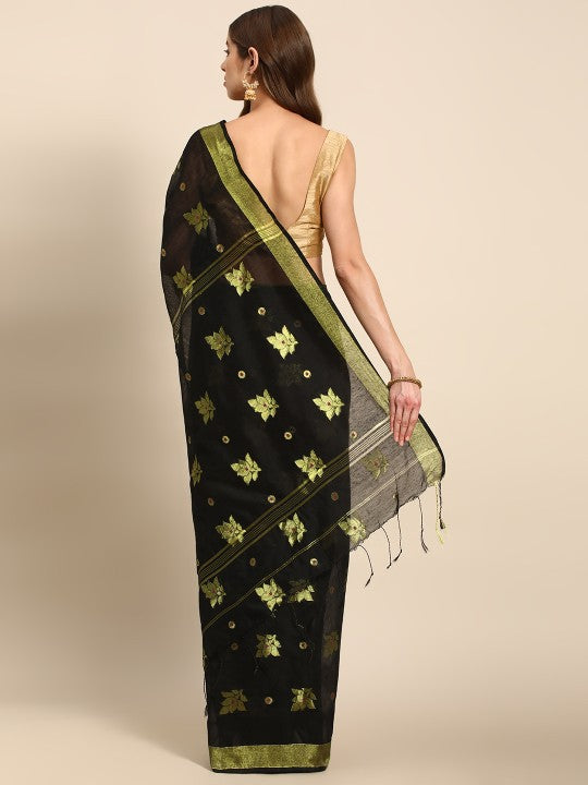 This exquisite DESH BIDESH Ethnic Motifs Zari Taant Saree, perfect for women, is available for Rs. 4799. Featuring a stylish black taant design, it showcases intricate ethnic motifs with a rich woven pattern. The saree is adorned with elegant zari detailing along its solid border. It includes an unstitched blouse piece, allowing for custom tailoring. Please refer to the blouse piece image for its actual appearance, as the model's blouse is for styling purposes. This saree, identified by Style ID: 22431792, offers a blend of traditional charm and contemporary elegance. It is an ideal choice for various ethnic occasions and celebrations. Experience the luxurious feel of this cotton blend fabric. Care for this beautiful garment with dry cleaning only. Acquire this authentic DESH BIDESH saree online for the best price.