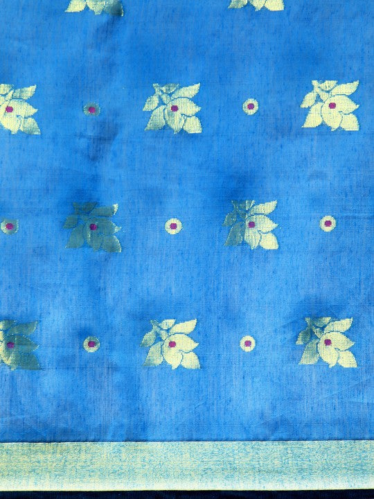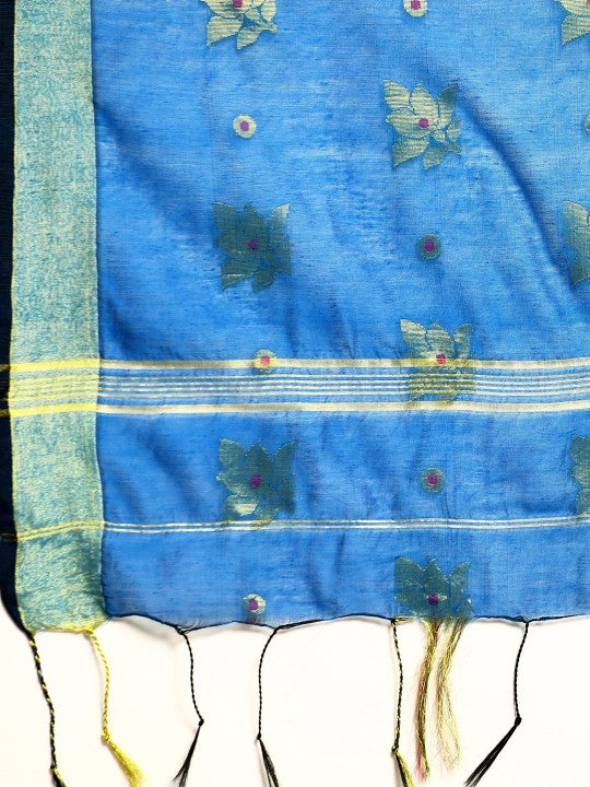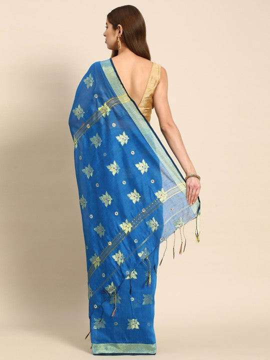 Buy DESH BIDESH Ethnic Motifs Zari Taant Saree - Sarees for Women from DESH BIDESH at Rs. 4799. Style ID: 22431840. This blue taant saree features ethnic motifs and a woven design with a solid border. It also has intricate zari detail. The saree includes an unstitched blouse piece. Please note, the blouse worn by the model is for styling purposes only. Kindly refer to the image of the blouse piece to understand its actual appearance.