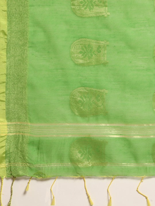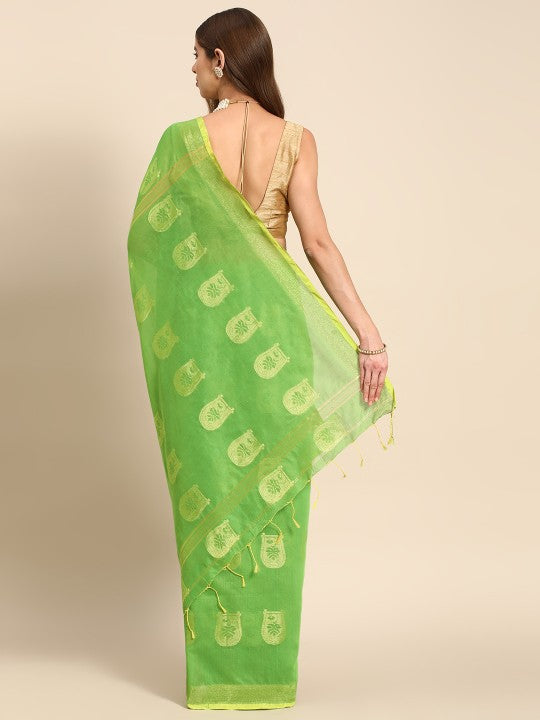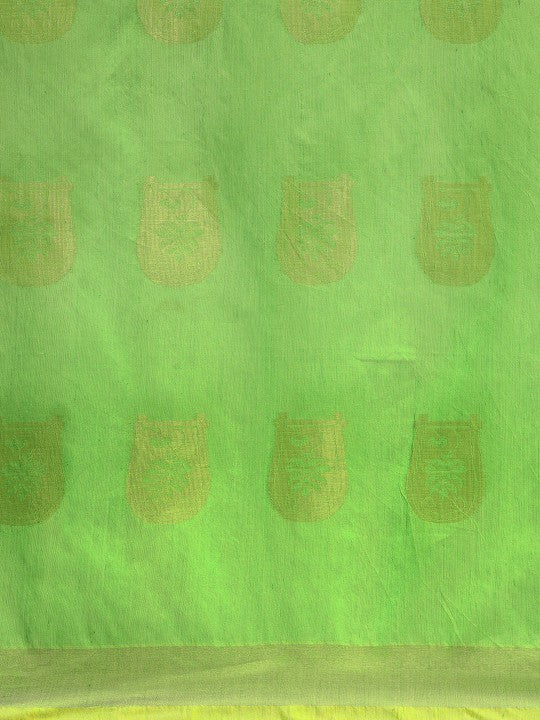 Green taant saree. Ethnic motifs woven design saree with solid border. Has zari detail. The saree comes with an unstitched blouse piece. The blouse worn by the model might be for modelling purpose only. Check the image of the blouse piece to understand how the actual blouse piece looks like.