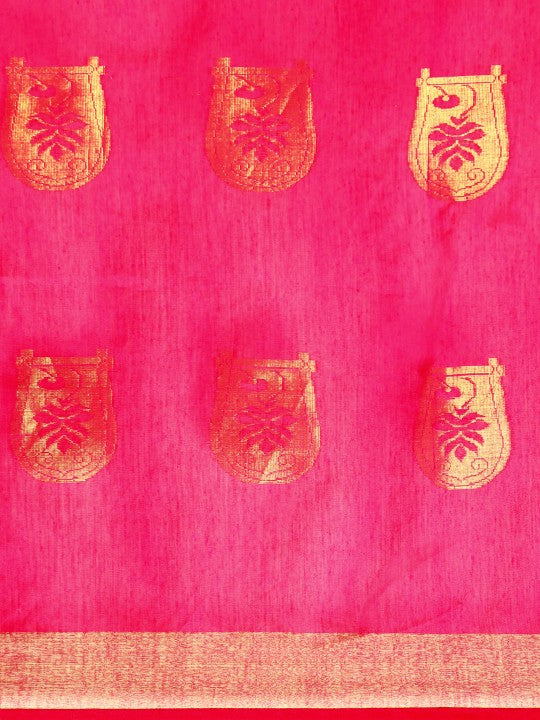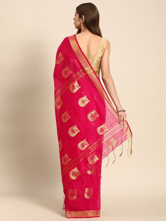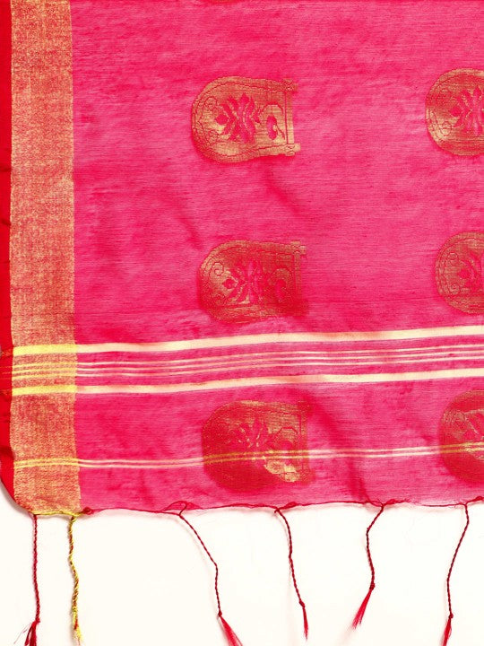 Pink taant saree. Ethnic motifs woven design saree with solid border. Has zari detail. The saree comes with an unstitched blouse piece. The blouse worn by the model might be for modelling purpose only. Check the image of the blouse piece to understand how the actual blouse piece looks like.