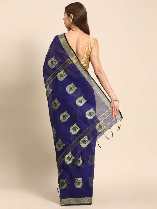 This exquisite DESH BIDESH Taant Saree features captivating ethnic motifs and intricate zari detailing. Crafted from a comfortable cotton blend, it ensures both elegance and ease of wear. The saree showcases a beautifully woven design with a distinct solid border, enhancing its traditional appeal. It comes complete with an unstitched blouse piece, allowing for custom tailoring. This versatile piece is perfect for festive occasions, cultural gatherings, or adding a touch of Indian heritage to your wardrobe. The rich blue hue complements various skin tones, making it a timeless addition. Experience the artistry of traditional Indian weaving with this authentic creation. Please note, the model's blouse is for styling purposes; refer to the provided image for the actual blouse piece design. This saree is a testament to fine craftsmanship and cultural elegance.