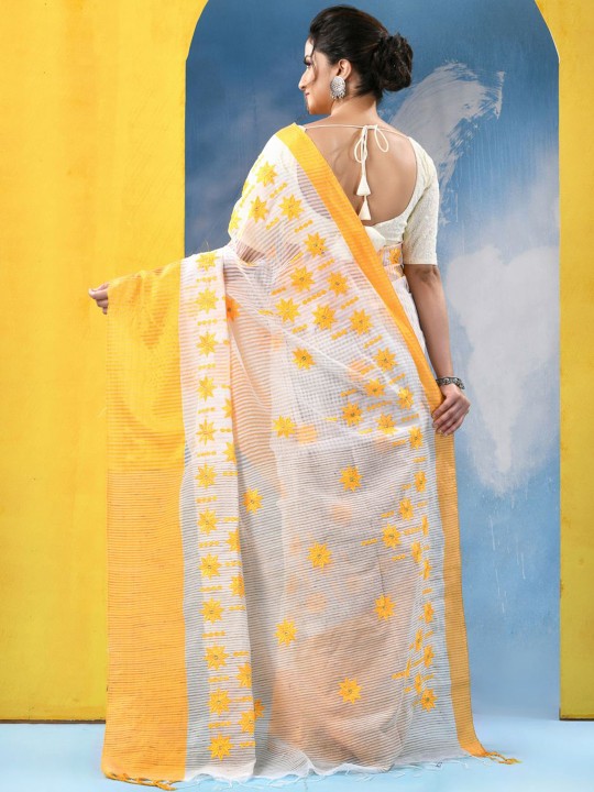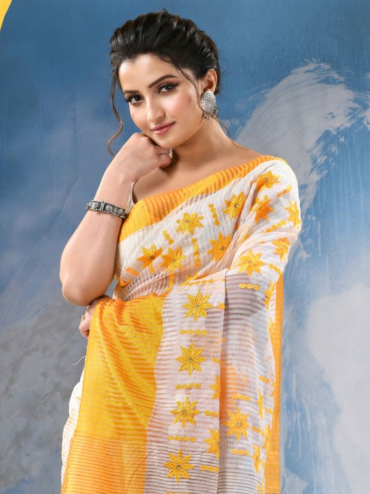 Adorn yourself in the exquisite DESH BIDESH Floral Embroidered Pure Cotton Khadi Saree, a timeless creation for the modern Indian woman. This elegant white and yellow khadi saree features intricate floral embroidery, adding a touch of traditional charm. The saree is meticulously crafted with a beautiful woven design border, enhancing its sophisticated appeal. Made from pure cotton, it ensures exceptional comfort and breathability, perfect for various occasions. The detailed embroidery reflects superior craftsmanship, making each piece unique. This saree includes an unstitched blouse piece, allowing for custom tailoring to achieve a perfect fit. Its lightweight nature makes it easy to drape and carry with grace. Ideal for festive gatherings, cultural events, or daily wear, this saree blends tradition with contemporary style. Embrace the rich heritage of Indian textiles with this stunning khadi saree. Dry clean only to maintain its pristine condition and vibrant colours.
