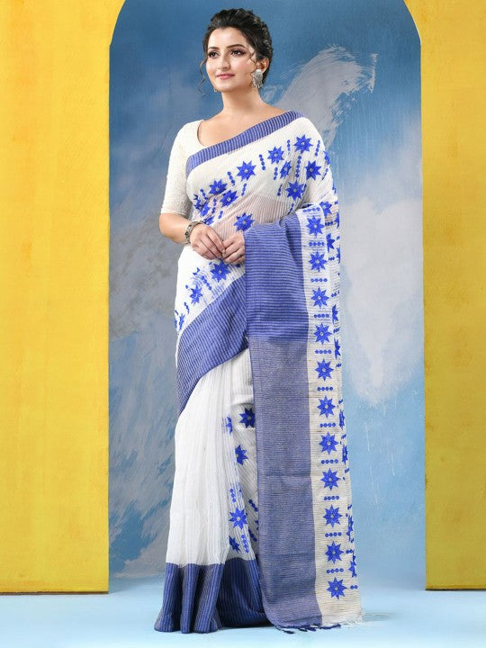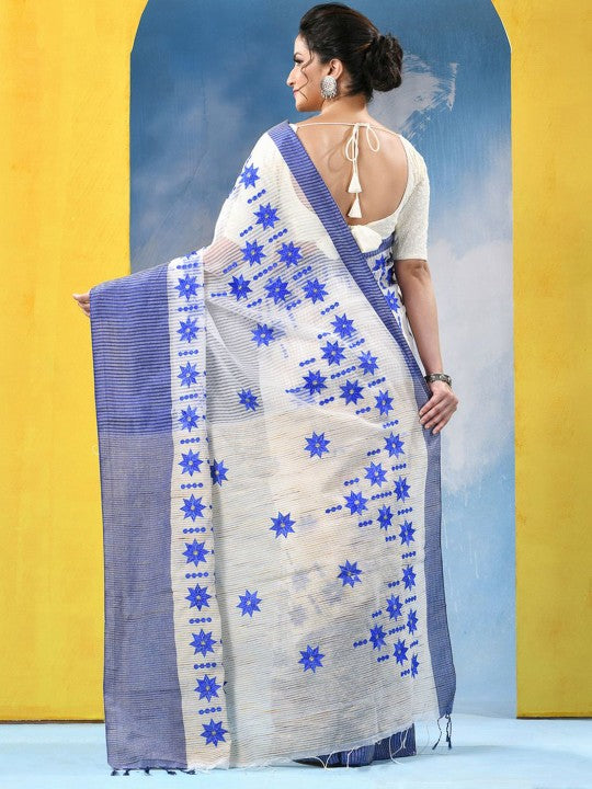 This DESH BIDESH Floral Embroidered Pure Cotton Saree features a beautiful white and blue design. It is a floral woven design saree, complete with a distinct woven design border. The saree has intricate embroidered details throughout. It comes with an unstitched blouse piece, allowing for custom tailoring. The blouse worn by the model is for styling purposes only; please check the image of the blouse piece to understand its actual appearance. The saree length is 18.04 feet (5.5 metres), with an additional 2.62 feet (0.8 metre) for the blouse piece. Its width is approximately 3.48 feet (1.06 metres). Both the saree fabric and blouse fabric are crafted from pure cotton, ensuring comfort and quality. For care, dry cleaning is recommended to maintain the fabric's integrity and embroidery. This product offers a blend of traditional aesthetics and comfortable wear.