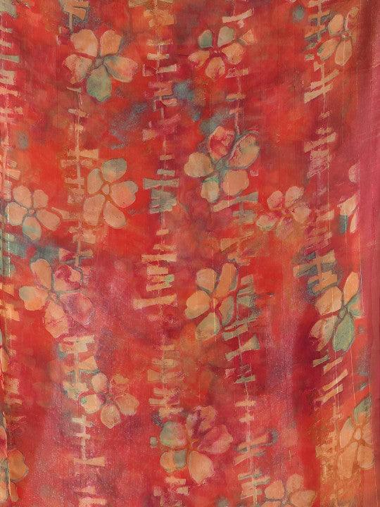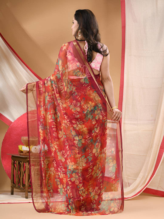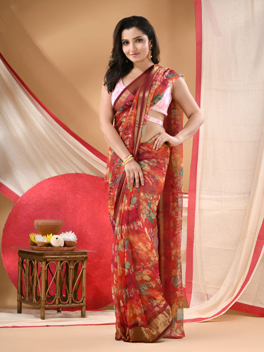 Red saree. Floral printed saree with zari border. The saree comes with an unstitched blouse piece. The blouse worn by the model might be for modelling purpose only. Check the image of the blouse piece to understand how the actual blouse piece looks like.