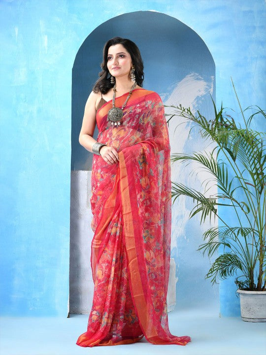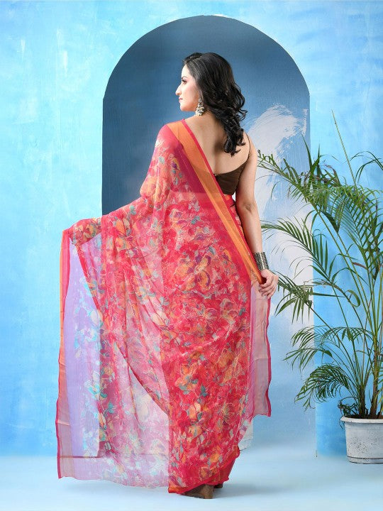 Pink and blue saree. Floral printed saree with zari border. Saree comes without a Blouse Piece. Length: 5.5 metres plus 0.8 metre blouse piece. Width: 1.06 metres (approx.). Saree Fabric: Poly Chiffon. Care: Dry Clean.