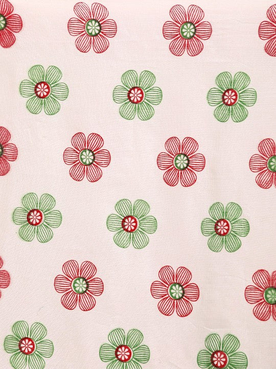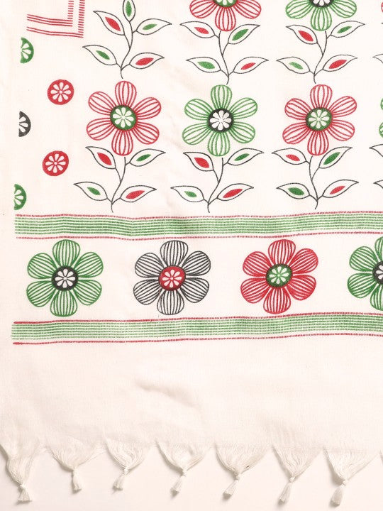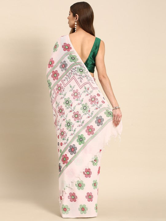 This exquisite white taant saree features a beautiful floral print without any border. It includes an unstitched blouse piece for your convenience. Please note, the blouse worn by the model is for styling purposes only. Kindly refer to the image of the blouse piece to see its actual appearance.