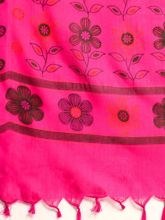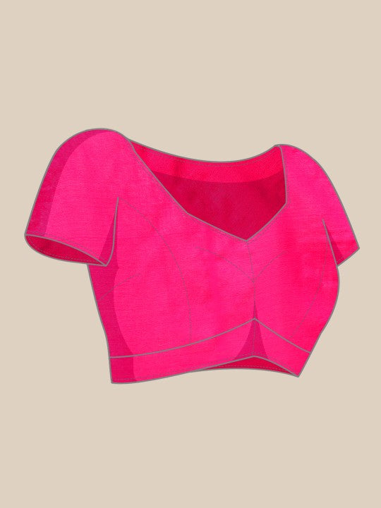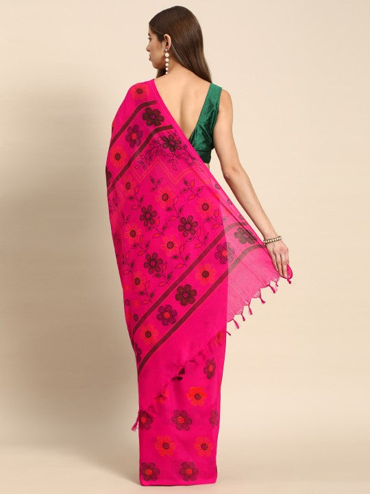 This beautiful pink Taant saree from DESH BIDESH features a delicate floral print without a border, offering an elegant aesthetic. It includes an unstitched blouse piece, allowing for custom tailoring. Please note that the blouse worn by the model is for styling purposes only; refer to the provided image of the blouse piece for its actual appearance. This pure cotton saree is designed for comfort and ease of wear. It is ideal for various occasions, blending traditional charm with contemporary style.