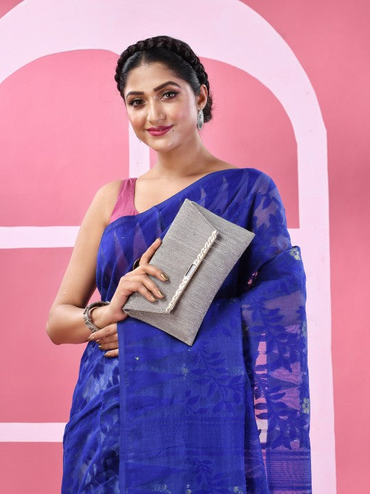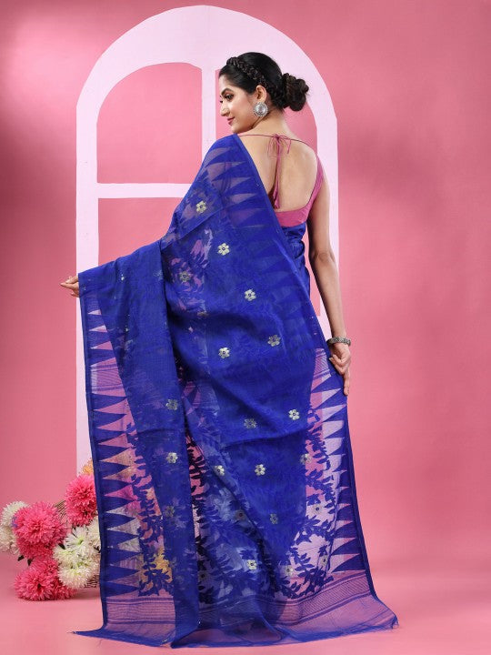 | Design Details | Blue, white jamdani saree |