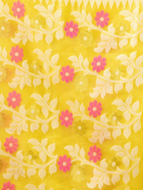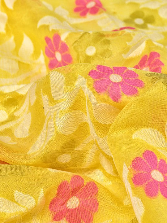 Description This beautiful DESH BIDESH Floral Woven Design Pure Cotton Jamdani Saree features an exquisite yellow and pink jamdani pattern. It showcases a finely woven design border, enhancing its traditional elegance. Crafted from pure cotton, this saree offers comfort and breathability for extended wear. Please note, the saree does not include a blouse piece; the model is wearing one for styling purposes only. This authentic saree is available for purchase at an attractive price. It is ideal for special occasions, adding a touch of grace to your ensemble. The lightweight fabric ensures ease of draping and comfortable movement. Embrace traditional Indian craftsmanship with this stunning piece. It's a perfect addition to any ethnic wardrobe. Buy this DESH BIDESH saree to experience true Indian textile artistry.