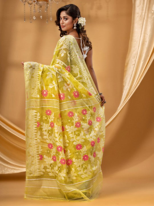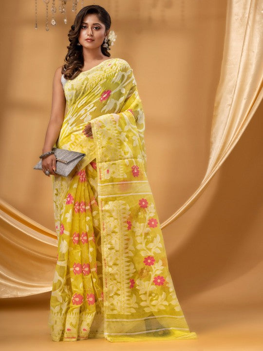This beautiful DESH BIDESH Floral Woven Design Pure Cotton Jamdani Saree features an exquisite yellow and pink jamdani pattern. It showcases a finely woven design border, enhancing its traditional elegance. Crafted from pure cotton, this saree offers comfort and breathability for extended wear. Please note, the saree does not include a blouse piece; the model is wearing one for styling purposes only. This authentic saree is available for purchase at an attractive price. It is ideal for special occasions, adding a touch of grace to your ensemble. The lightweight fabric ensures ease of draping and comfortable movement. Embrace traditional Indian craftsmanship with this stunning piece. It's a perfect addition to any ethnic wardrobe. Buy this DESH BIDESH saree to experience true Indian textile artistry.