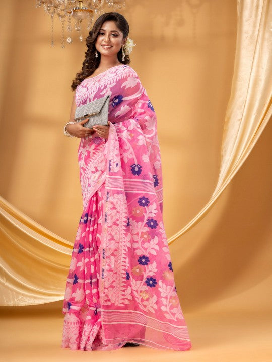 This exquisite DESH BIDESH Jamdani Saree, crafted from pure cotton, features a captivating pink and white colour combination. It showcases an intricate floral woven design alongside a beautifully detailed woven border. The saree is further enhanced with delicate zari work, adding a touch of traditional elegance. This lightweight and comfortable attire is perfect for various festive occasions and cultural gatherings. The breathable pure cotton fabric ensures comfort throughout the day, making it an ideal choice for the Indian climate. Its unique Jamdani weave highlights the rich heritage of Indian textiles. Please note, this saree does not include a blouse piece; the model is wearing a separate blouse for styling purposes. Elevate your ethnic wardrobe with this timeless and graceful Jamdani saree, reflecting sophisticated craftsmanship and traditional charm.