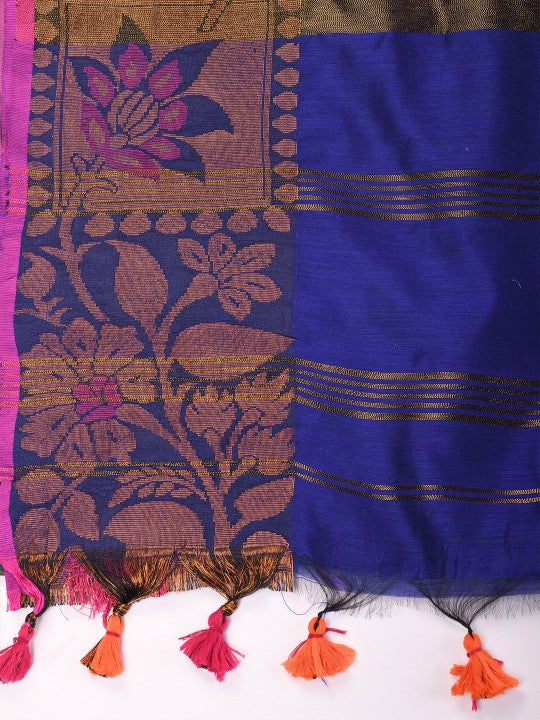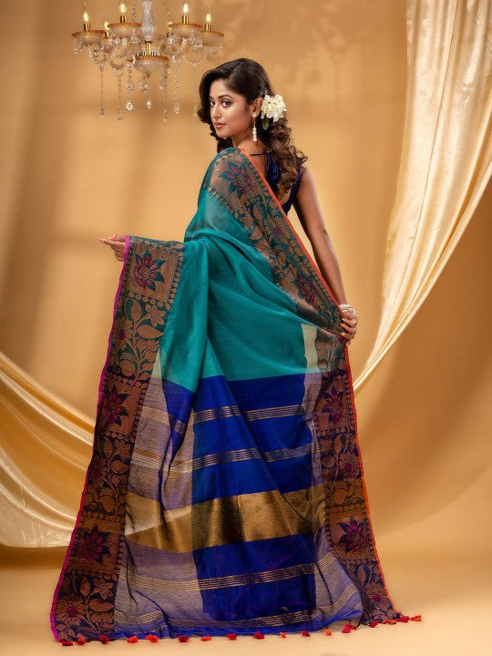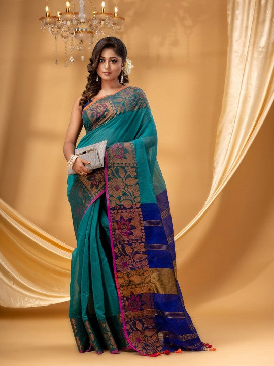 Buy DESH BIDESH Floral Woven Dsign Zari Silk Cotton Taant Saree - Sarees for Women from DESH BIDESH at Rs. 1364. Style ID: 25093476. The saree features a turquoise blue and gold-toned taant design. It is a solid saree with an elegant woven design border and intricate zari detailing. The saree includes an unstitched blouse piece for customisation. Please refer to the blouse piece image for its actual appearance, as the model's blouse is for styling purposes only.