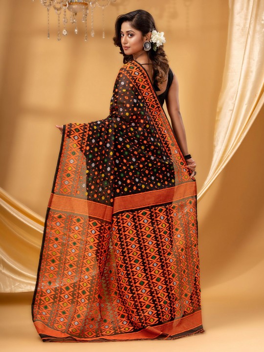 Expertly crafted, this DESH BIDESH Jamdani Saree showcases intricate floral woven designs. Made from premium pure cotton, it offers exceptional comfort and a luxurious drape. The exquisite woven border adds a touch of traditional elegance, enhancing its overall appeal. This saree is a testament to the rich heritage of Indian textile artistry. Its breathable fabric ensures wearability for extended periods, making it suitable for various occasions. The vibrant black and orange colour palette provides a striking visual contrast. This piece is designed for the discerning woman who appreciates classic aesthetics and superior craftsmanship. It embodies a blend of cultural richness and contemporary style. Elevate your ethnic wardrobe with this timeless and sophisticated Jamdani saree.