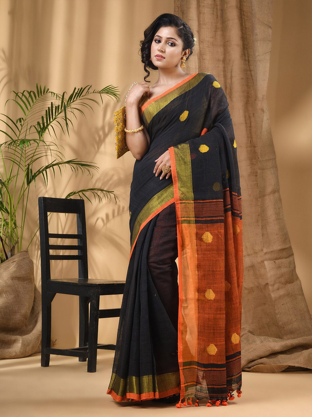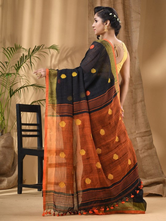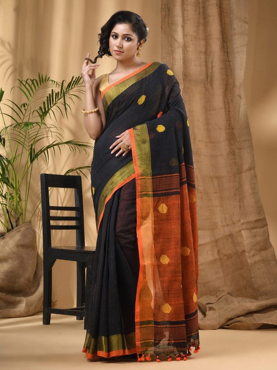 Discover the elegance of the DESH BIDESH Geometric Woven Design Pure Cotton Saree, a timeless addition to your ethnic wardrobe. This exquisite black and red saree features a captivating geometric woven pattern, complemented by a sophisticated solid border. Crafted from premium pure cotton fabric, it ensures both comfort and breathability throughout the day. The saree comes with an unstitched blouse piece made from matching pure cotton, allowing for customisation to your unique style. Its lightweight texture drapes beautifully, making it ideal for various occasions, from festive celebrations to casual gatherings. This traditional Indian attire reflects a rich cultural heritage with its intricate design and vibrant colours. Experience the blend of classic aesthetics and modern comfort with this versatile pure cotton saree. Perfect for women seeking a graceful and authentic ethnic look, it embodies quality craftsmanship. Elevate your style effortlessly with this must-have ensemble. Ensure dry cleaning for optimal care and longevity of the fabric.