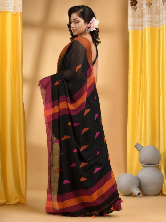This elegant black and pink taant saree features a captivating geometric woven design, complemented by a sophisticated solid border. Crafted from pure cotton, it offers exceptional comfort and a graceful drape. The saree measures approximately 6 yards in length, including 0.9 yards for the unstitched blouse piece. Its approximate width is 41.7 inches, providing ample fabric for a beautiful silhouette. This handloom creation requires dry clean care to maintain its pristine quality and vibrant colours. It is an ideal choice for festive occasions, traditional gatherings, or daily wear, blending cultural heritage with contemporary style. The intricate weaving showcases fine craftsmanship and attention to detail. This saree ensures a comfortable and breathable experience, perfectly suited for the Indian climate. Its versatile design allows for various styling options, making it a valuable addition to your ethnic wardrobe. Elevate your traditional ensemble with this timeless and exquisite piece.