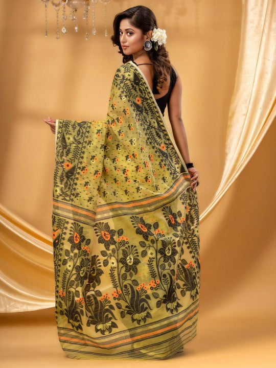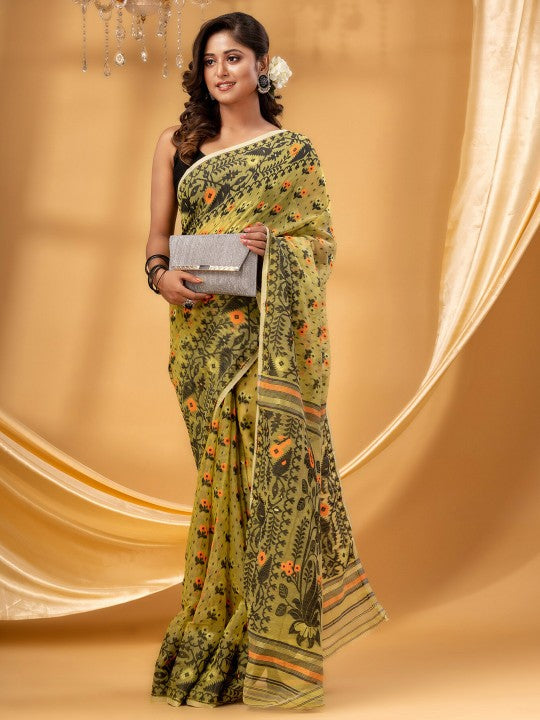 This exquisite DESH BIDESH Jamdani Saree, crafted from pure cotton, features a captivating green and black palette. It showcases intricate ethnic motifs woven into the fabric, reflecting traditional artistry. The saree's design incorporates a distinguished woven border, adding to its classic appeal. Designed for comfort and elegance, this piece offers a graceful drape suitable for various occasions. It embodies the rich heritage of Indian textiles, making it a valuable addition to any ethnic wardrobe. This saree does not include a blouse piece, allowing for personalized styling. Its lightweight nature ensures ease of wear throughout the day. Experience the timeless beauty and sophisticated charm of this authentic Jamdani creation.