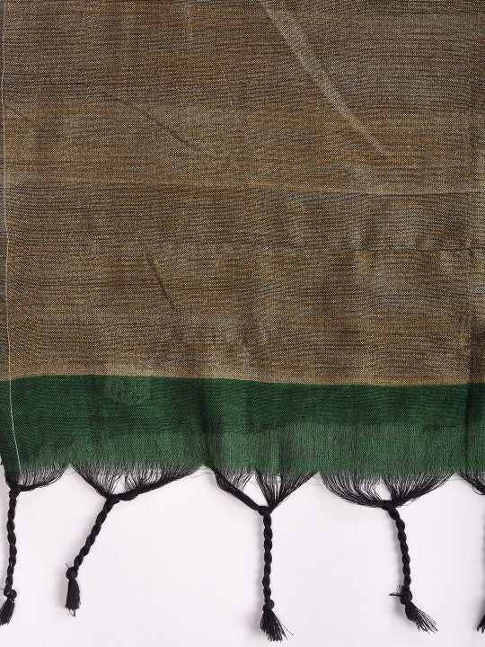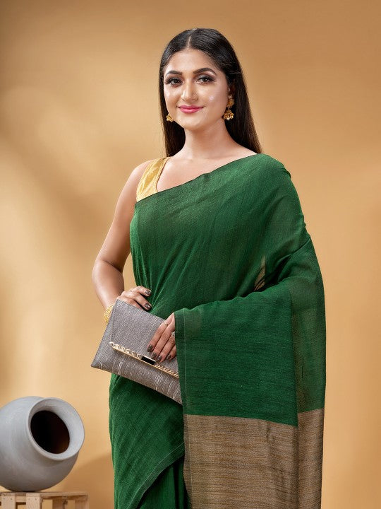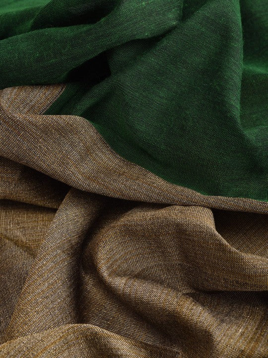 This exquisite green and gold-toned saree is meticulously crafted from pure cotton, offering a blend of traditional aesthetics and modern comfort. The handloom khadi fabric ensures breathability and a graceful drape, suitable for various occasions. Its solid design, devoid of a border, contributes to a clean and contemporary appearance. The intrinsic quality of the cotton provides a soft texture against the skin, enhancing wearer comfort throughout the day. This saree embodies an understated elegance, making it a versatile addition to any discerning wardrobe. It does not include a blouse piece, allowing for personalized styling. The fabric is designed for longevity and ease of maintenance. This garment represents a fusion of heritage craftsmanship with practical wearability. The rich color palette complements diverse complexions. It is recommended to dry clean this saree to preserve its pristine condition.