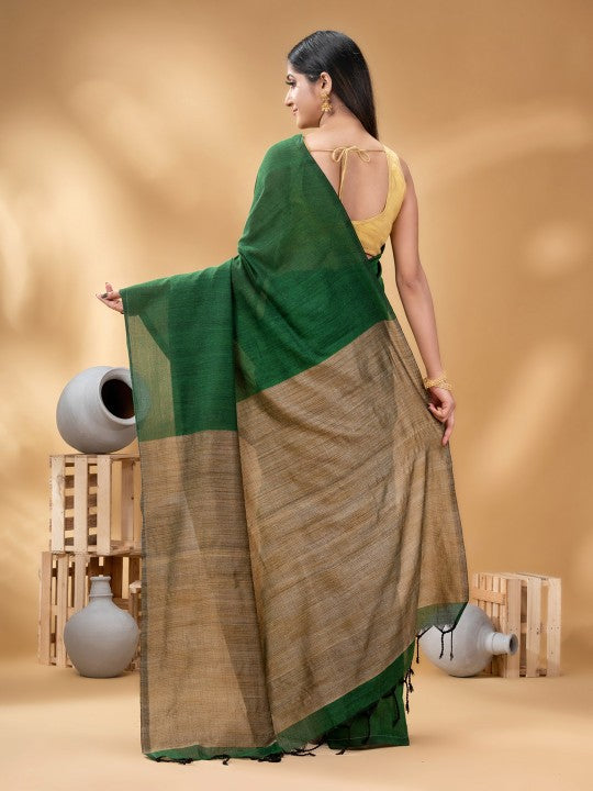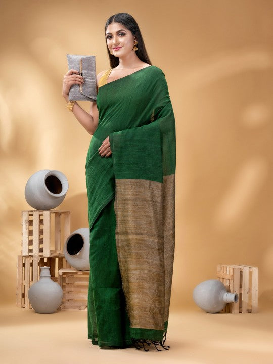 Experience the refined elegance of the DESH BIDESH Green and Gold-Toned Pure Cotton Handloom Khadi Saree. This meticulously crafted drape showcases traditional Indian textile artistry. Its pure cotton fabric ensures exceptional comfort and breathability, ideal for extended wear. The saree features a solid body, allowing the rich green and subtle gold-toned accents to stand out. Intricate Zari detailing adds a touch of sophisticated shimmer without overwhelming the classic design. This piece is perfect for cultural gatherings, festive celebrations, or formal events where understated grace is desired. It reflects a heritage of quality and timeless style. Please note, the saree does not include a blouse piece; the model's blouse is for illustrative purposes only. Elevate your ethnic wardrobe with this authentic and distinguished handloom creation.