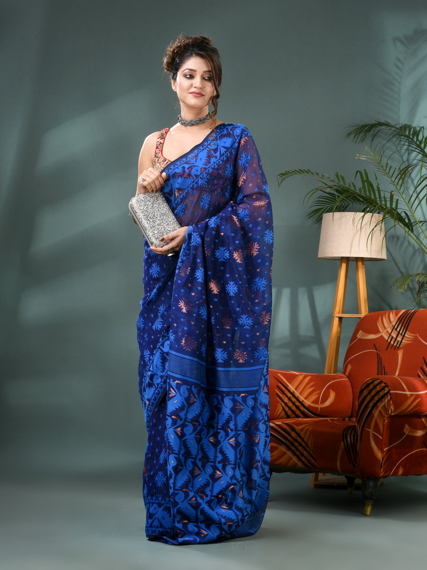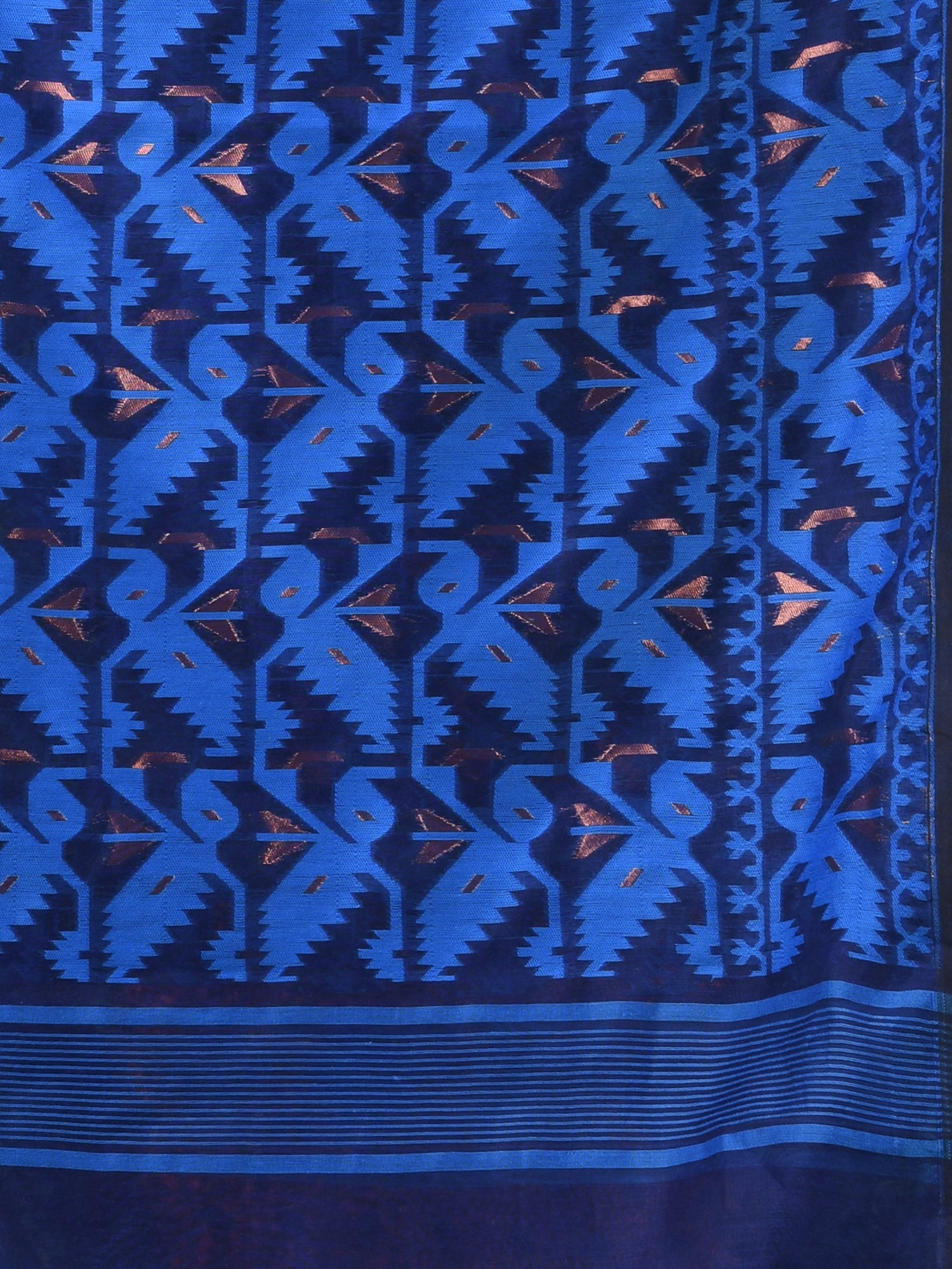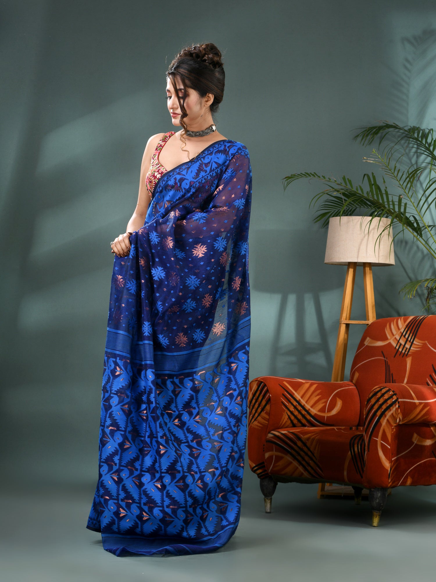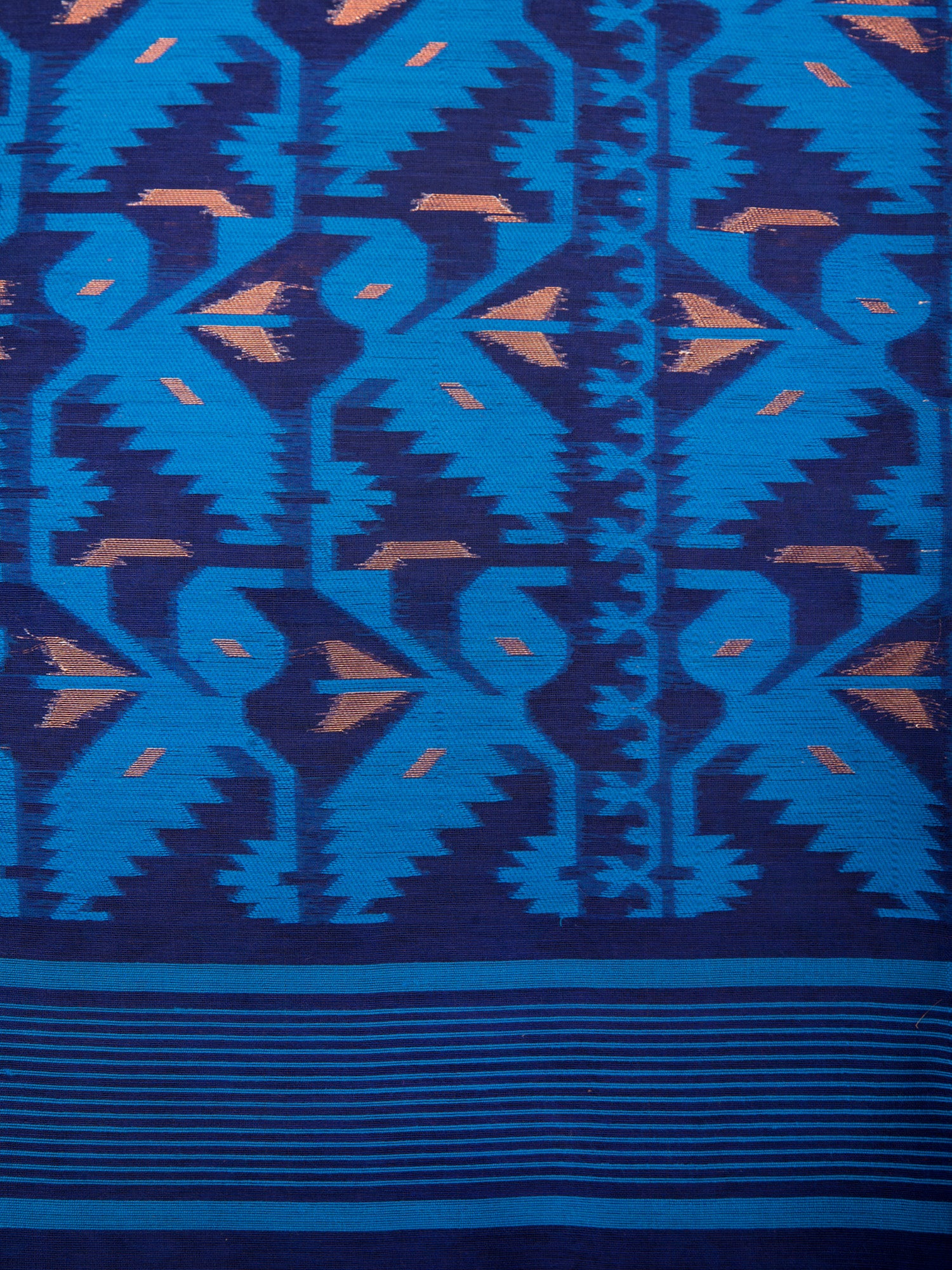 Whether you're attending a wedding, dressing for a party, or simply want to showcase authentic Bengal tradition, this blue Jamdani cotton saree will make you stand out. It reflects the essence of Dhakai Jamdani weaving, featuring traditional motifs and a graceful pallu.