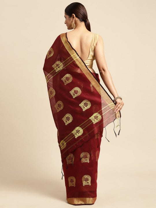 This Maroon and golden taant saree features ethnic motifs woven design with a solid border. The saree comes with an unstitched blouse piece. The blouse worn by the model is for modelling purpose only. Please check the image of the blouse piece to understand how the actual blouse piece looks like.