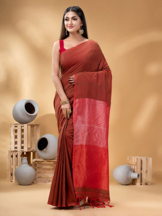 This exquisite Taant saree, meticulously crafted with a woven design, presents a sophisticated appeal for any discerning woman. The rich maroon hue, complemented by a solid border, exudes traditional elegance. Constructed from a high-quality cotton blend, this saree offers both comfort and durability. The absence of a blouse piece allows for personalized styling, enabling a unique and tailored ensemble. Its intrinsic design and material composition make it suitable for various occasions, from festive gatherings to formal events. This garment embodies a blend of timeless aesthetics and practical wearability. The fabric ensures graceful draping and a comfortable fit throughout the day. It is a testament to skilled craftsmanship and attention to detail. This saree is an essential addition to any curated wardrobe, offering versatility and refined charm.