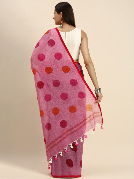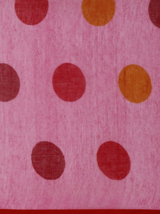 This elegant pink taant saree features a charming polka dot print, beautifully complemented by a solid border. Crafted from pure cotton, this saree offers exceptional comfort and a graceful drape. Please note, the saree does not include a blouse piece; the model is wearing one for styling purposes only. It measures approximately 18.04 feet in length and 3.48 feet in width. For best care, dry clean only to maintain its pristine condition and vibrant colours.