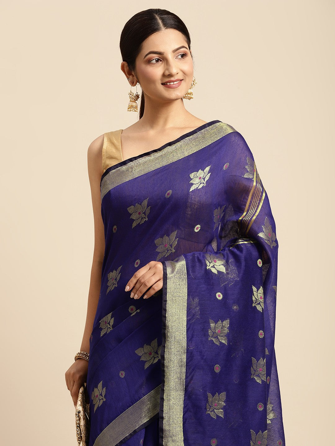 Description This DESH BIDESH Navy Blue & Golden Ethnic Motifs Pure Cotton Muga Saree is a stunning traditional Indian garment. It features an elegant navy blue base adorned with intricate golden ethnic motifs. The saree is designed with a striking solid border, enhancing its classic appeal. Crafted from pure cotton, it ensures comfort and breathability for extended wear. The accompanying unstitched blouse piece allows for custom tailoring to achieve a perfect fit. Please note that the blouse worn by the model is for styling purposes only; refer to the provided image for the actual blouse piece. This saree measures approximately 18.04 feet in length, with an additional 2.62 feet for the blouse piece. Its width is approximately 3.48 feet, offering graceful draping. For care, dry cleaning is recommended to maintain the fabric's integrity and vibrant colours. This exquisite muga saree blends traditional aesthetics with modern comfort, making it ideal for festive occasions and celebrations.