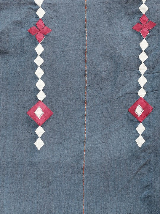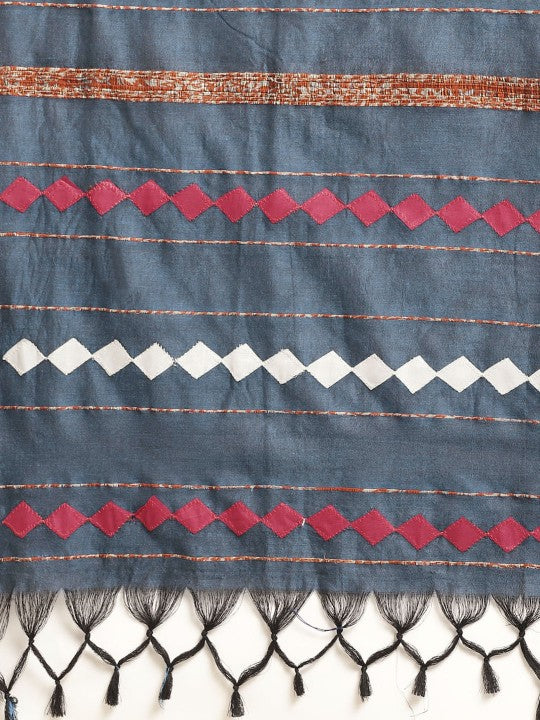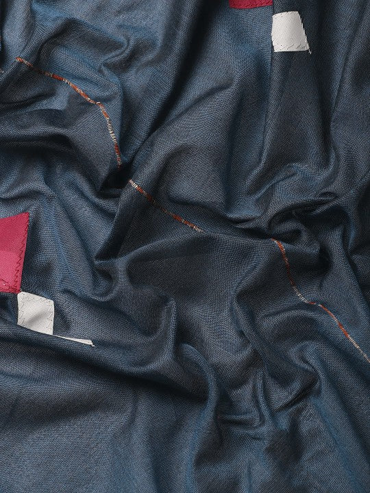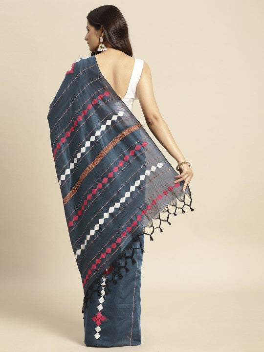 This elegant DESH BIDESH Navy Blue & White Pure Cotton Taant Saree is a beautiful choice for women. It features a sophisticated navy blue and white taant design. The saree boasts a geometric woven pattern with no border. It includes an unstitched blouse piece for customization. Please note, the blouse worn by the model is for styling purposes only; refer to the provided image for the actual blouse piece. This saree is available at Myntra for Rs. 4299. Its Style ID is 20487980.
