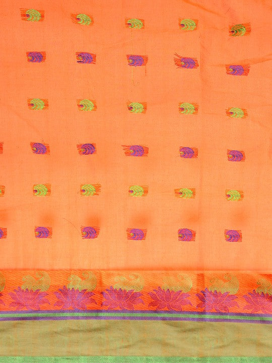 Orange & Green Ethnic Motifs Pure Cotton Taant Saree
