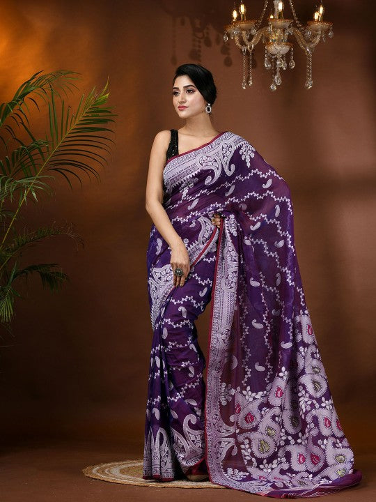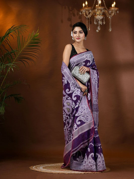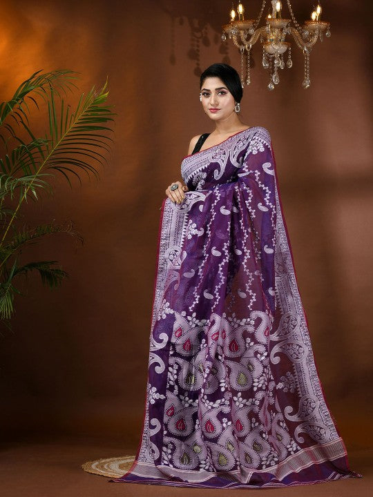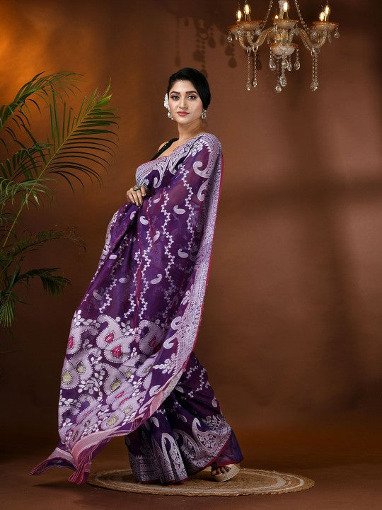 This exquisite jamdani saree from DESH BIDESH exemplifies traditional Indian craftsmanship. Featuring a delicate lavender and white color palette, the saree is adorned with intricate paisley and zari work, creating a visually stunning effect. The woven design border adds a touch of elegance and sophistication, ensuring a refined drape. Crafted from a comfortable cotton blend, this saree is both lightweight and breathable, making it suitable for extended wear. The accompanying blouse piece allows for custom tailoring, ensuring a perfect fit and cohesive ensemble. This piece is ideal for festive occasions and cultural celebrations, offering timeless appeal and grace. Proper care, including dry cleaning, will maintain its pristine condition and vibrant colors.